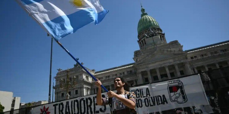 Mientras se desarrolla el debate en el recinto del Congreso, organizaciones sociales y gremiales realizaron protestas frente al edificio legislativo, con consignas contra la reforma.